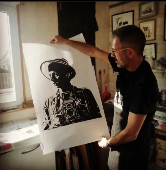 Artiste actif depuis quelques années dans la région de Lorient. Mes premiers amours sont la photo et les arts de rue, et cette passion m’a amené à m’y essayer, par le biais de pochoirs et de collages que j’installe au grès de mes promenades. La linogravure s’est rajoutée avec une approche « récup’ » de ma part. En effet je ne grave que du linoléum de récupération destiné au sol.